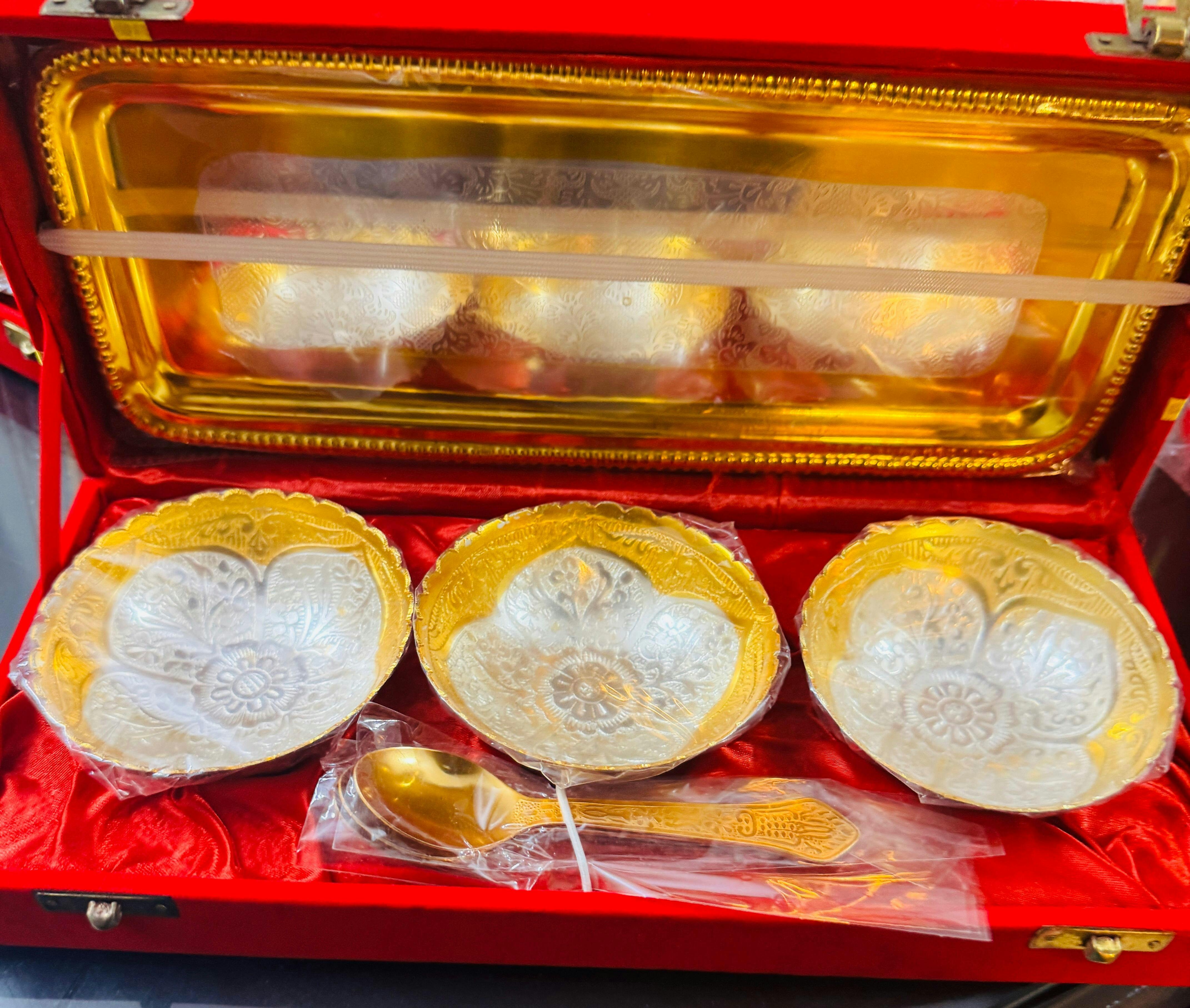 German Silver & Gold Plated Flower Design Three Bowl Set with Tray & Spoons | Premium 7 Pcs Gift Set